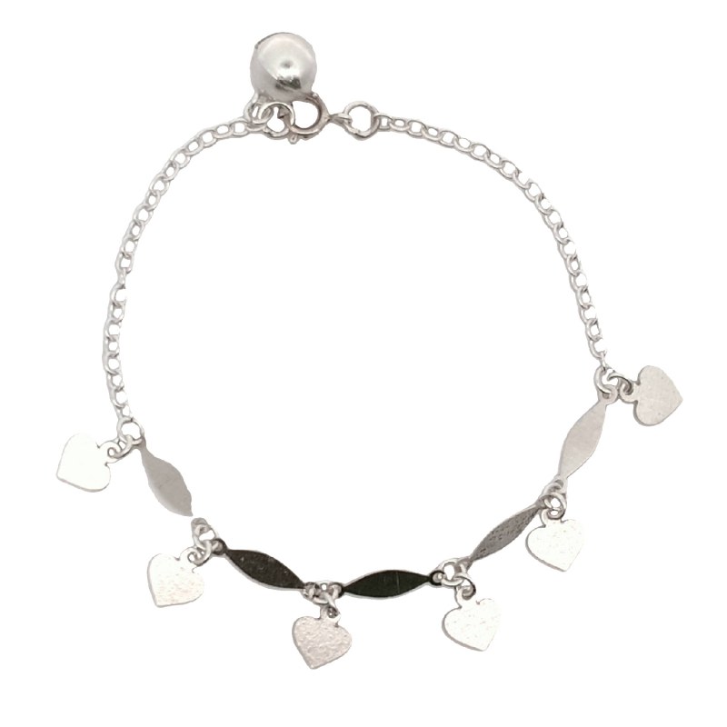 Pulsera corazones colgante y cascabel 18cms plata 925